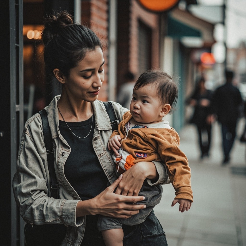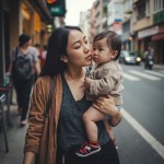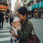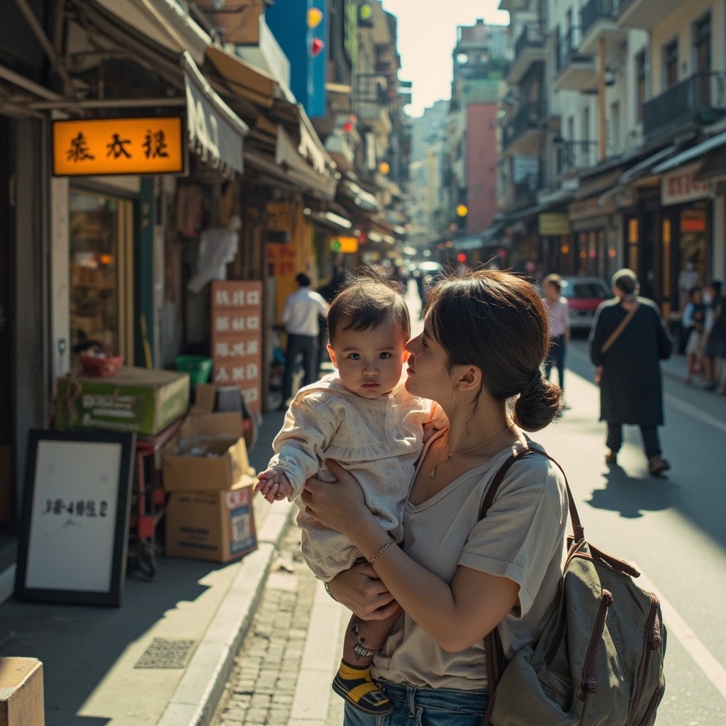 Asian Mother with Baby Working on Street