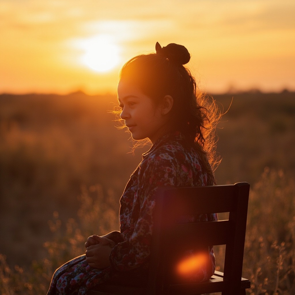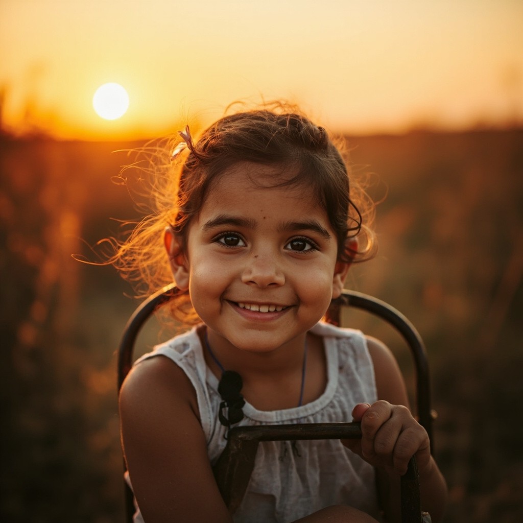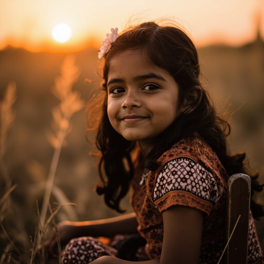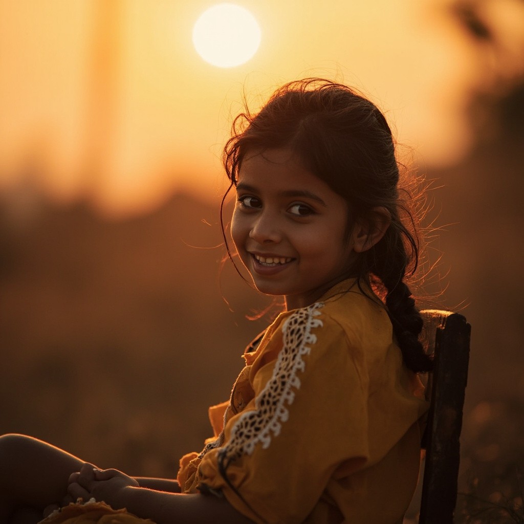 Indian Girl Sitting on Small Chair with Sunset Focus on Cheeks