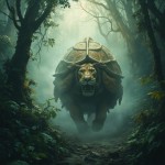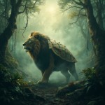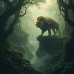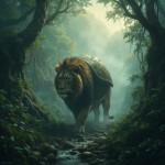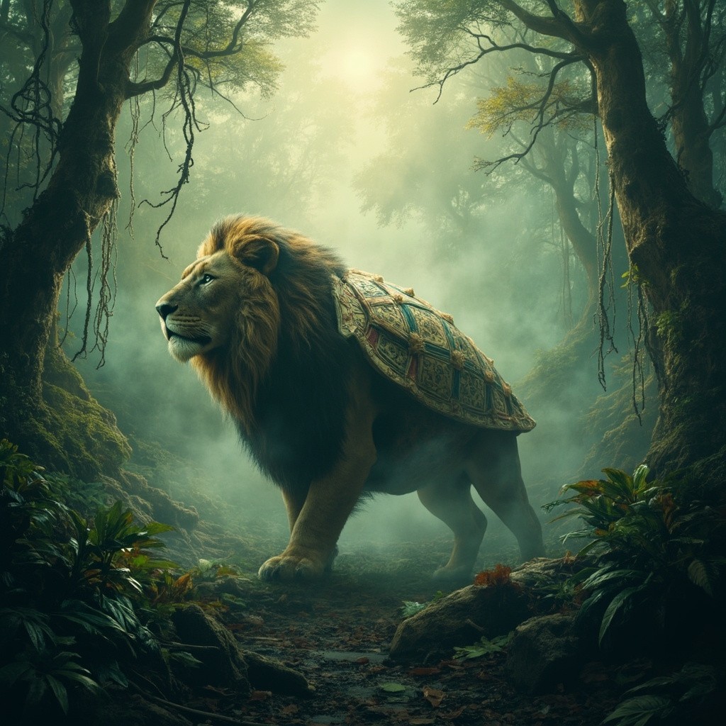Misty Dawn in Enchanted Jungle with Ancient Lion
