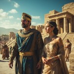 **Prompt for AI:** "Generate a vivid and historically accurate scene set in ancient Persepolis, depicting a Persian king and his wife. Describe the architectural grandeur of Persepolis, including its monumental staircases, intricate reliefs, and the overall atmosphere of the royal city. Portray the king in his regal attire, highlighting the symbols of power and authority he embodies. Include detailed descriptions of his wife, focusing on her clothing, jewelry, and demeanor. Capture the interaction between them, emphasizing their relationship, cultural significance, and the backdrop of a grand royal ceremony or daily life in the palace. Incorporate sensory details such as sounds, scents, and the vibrancy of the court, ensuring to reflect the historical context of Achaemenid Persia."