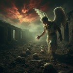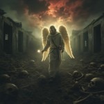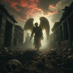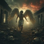 Anguished Angel Walking Through Ruins of Forsaken Village