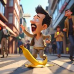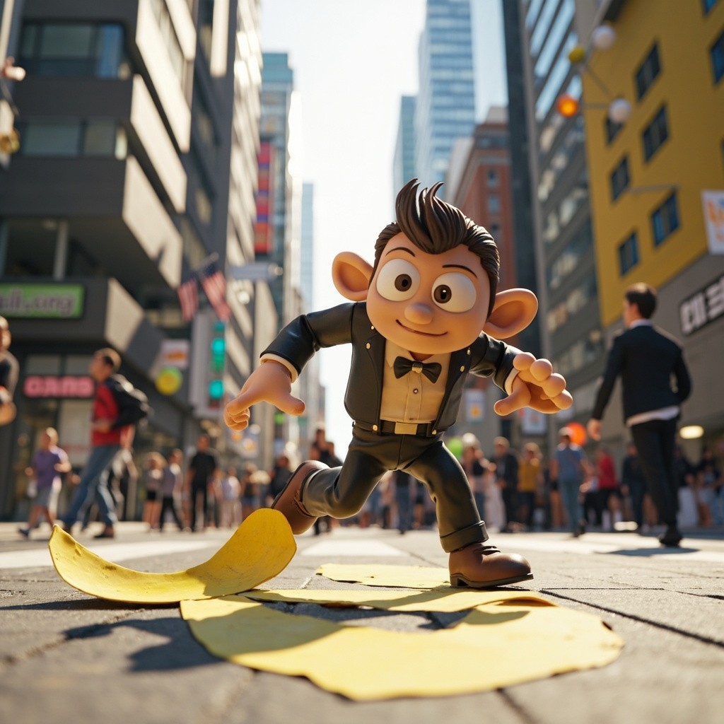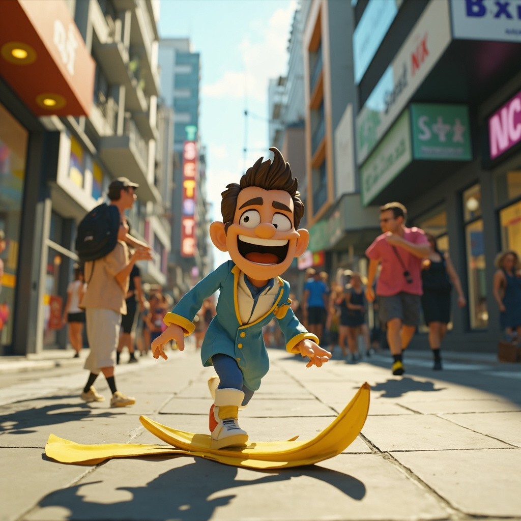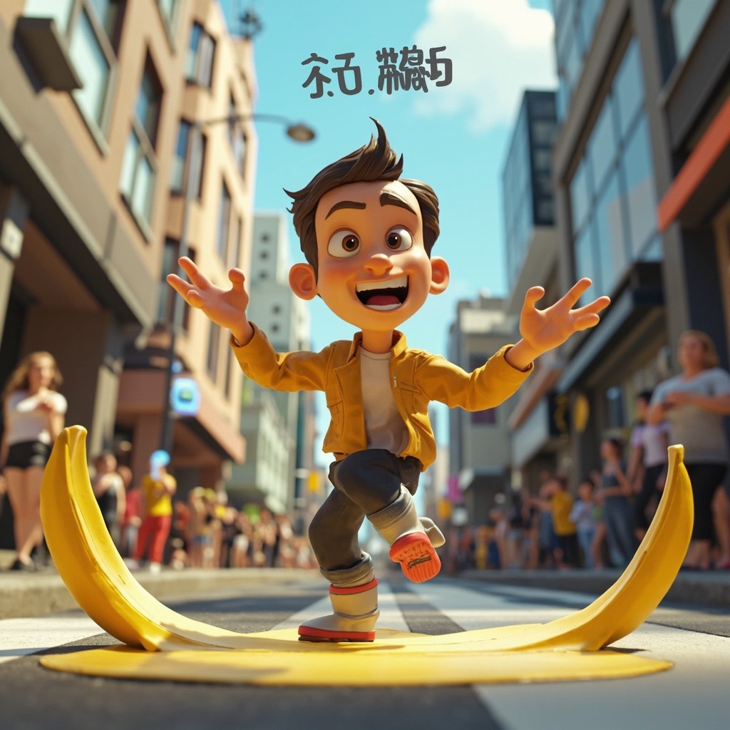 3D Cartoon of Expressive Character Slipping on Banana Peel in Modern City