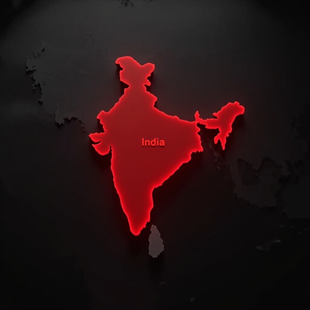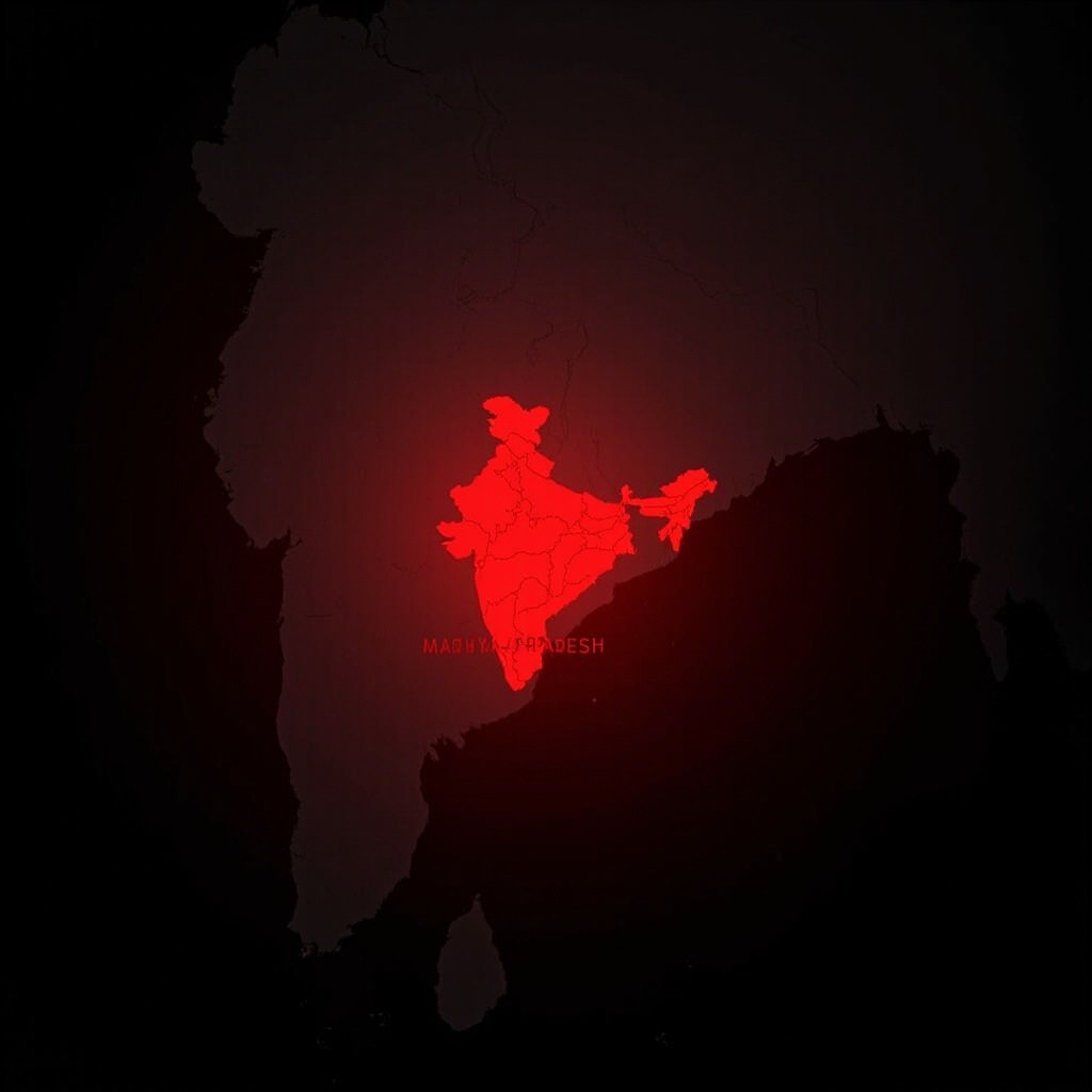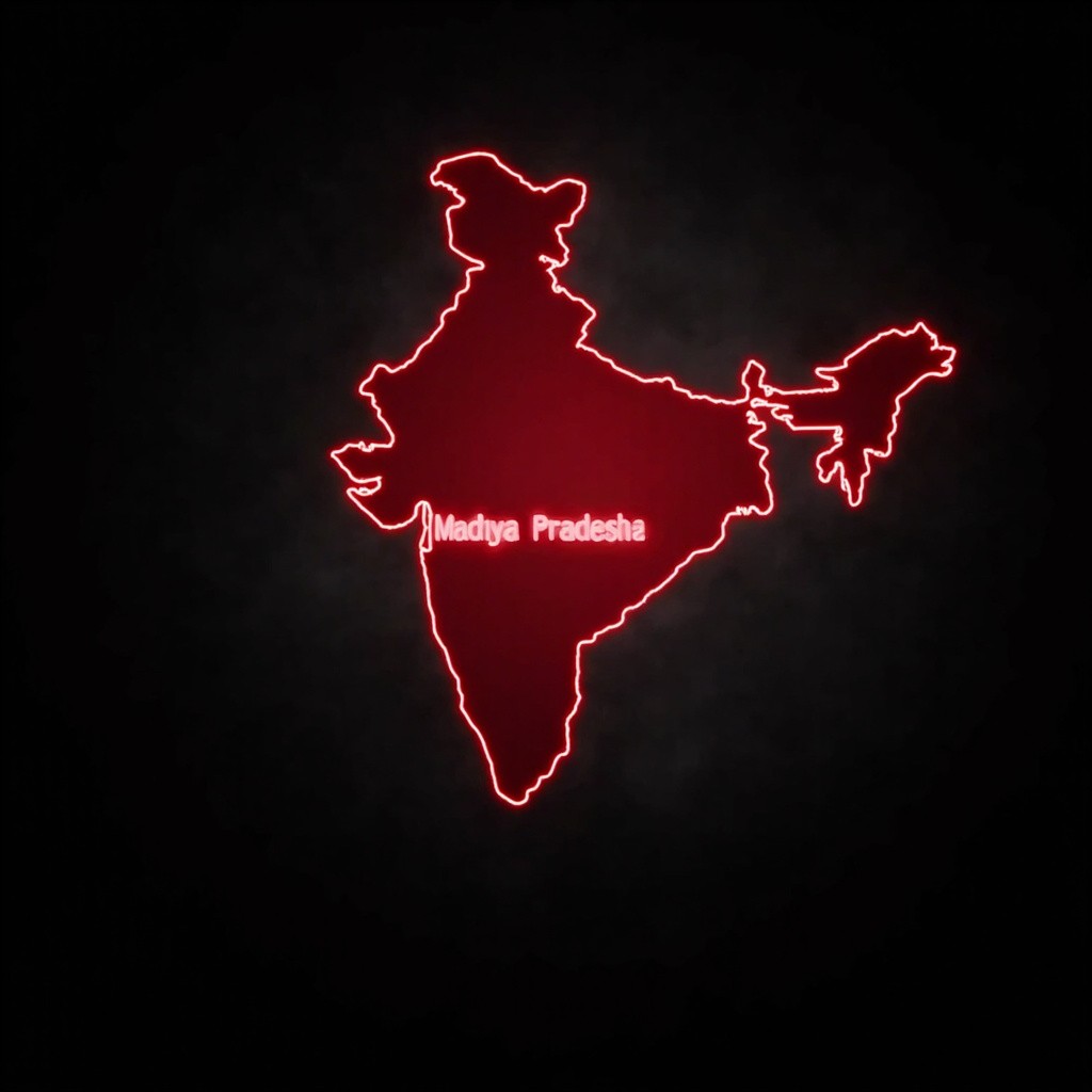 Map animation: Start from a full world map view, then smoothly zoom into India. Highlight India’s border with a glowing red outline. Continue zooming into the state of Madhya Pradesh, center it, and fill the state area with a solid red color and a soft red glow. Add smooth cinematic camera motion, depth lighting, and clear labels: “India” and “Madhya Pradesh” with fade-in text animation in red. Keep the background dark grey or black for high contrast, and use a modern, clean motion-graphics style.
