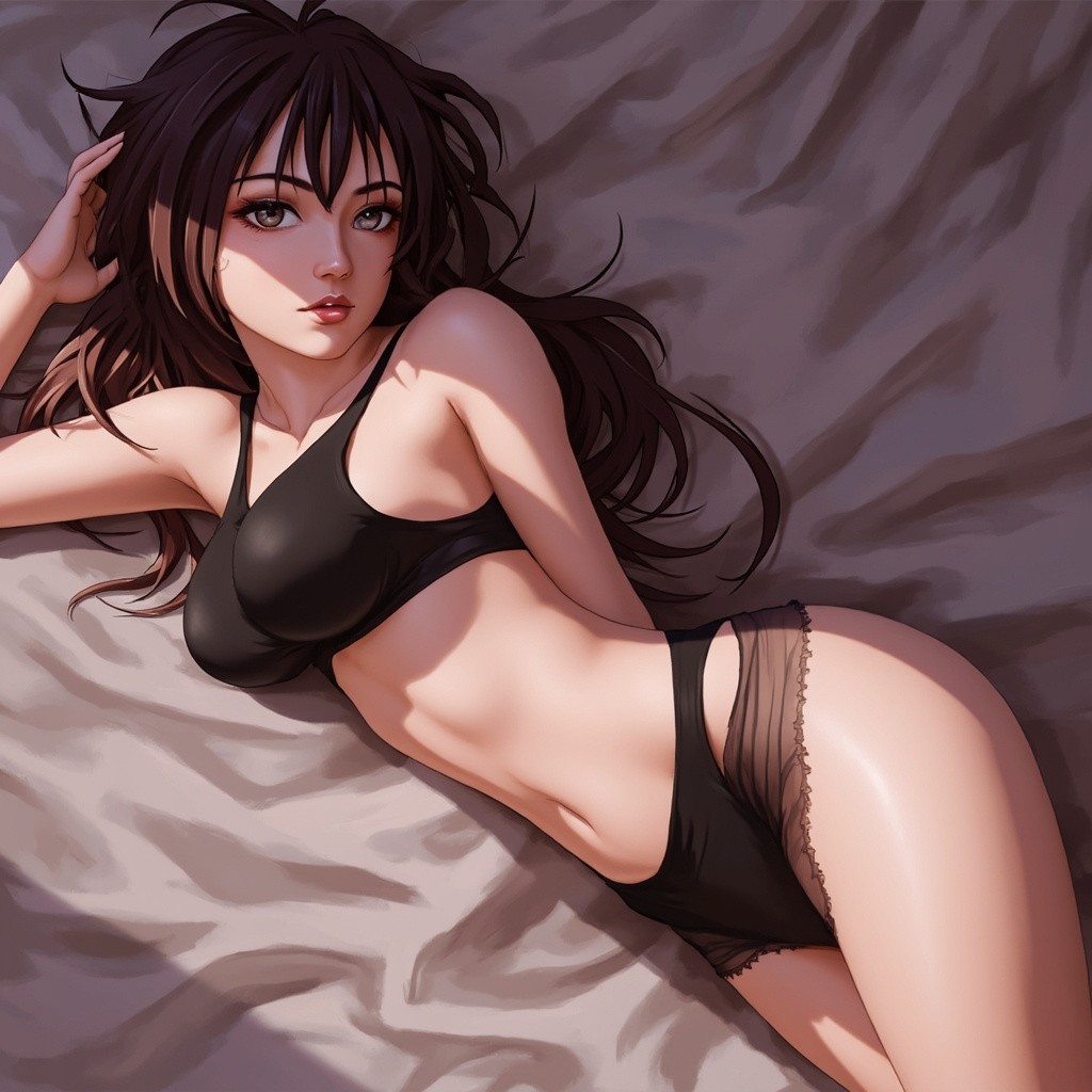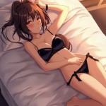 Beautiful Anime Girl in Black Lingerie Lying on Bed