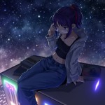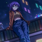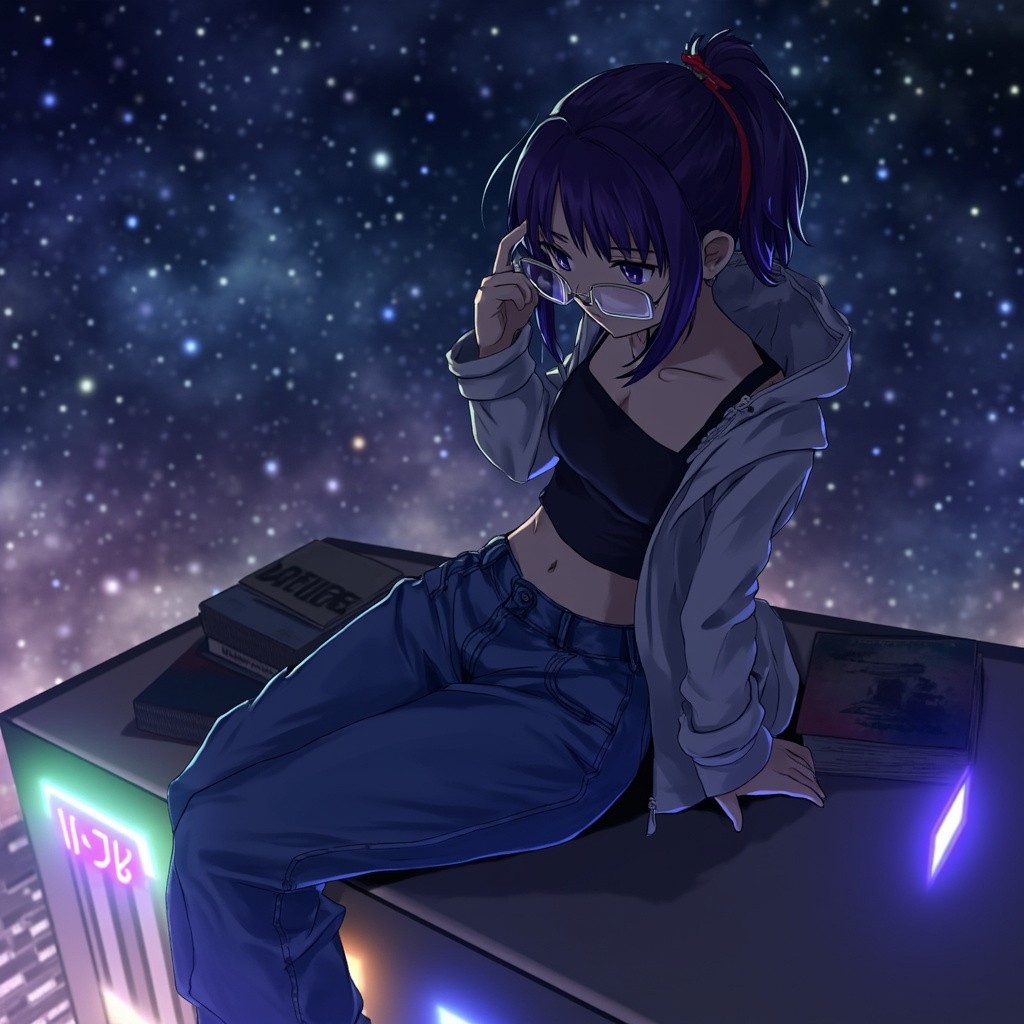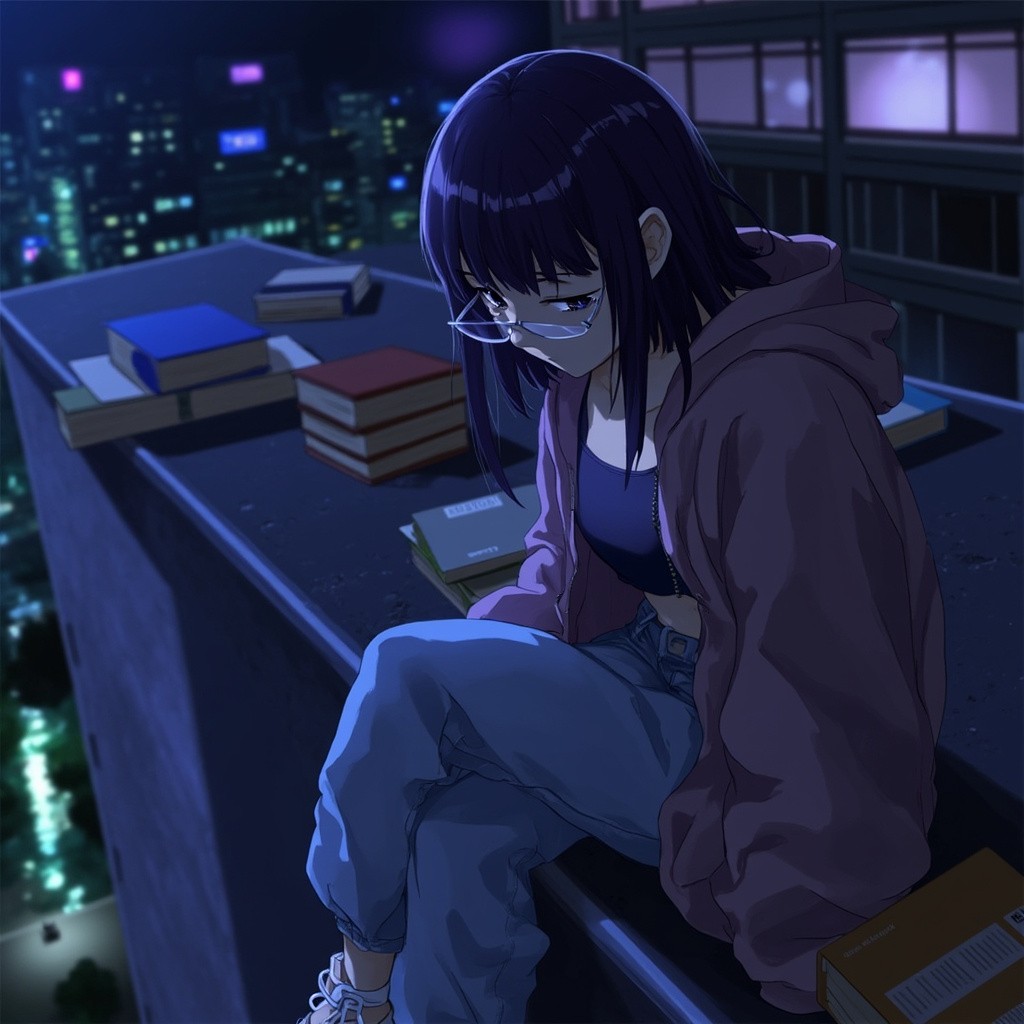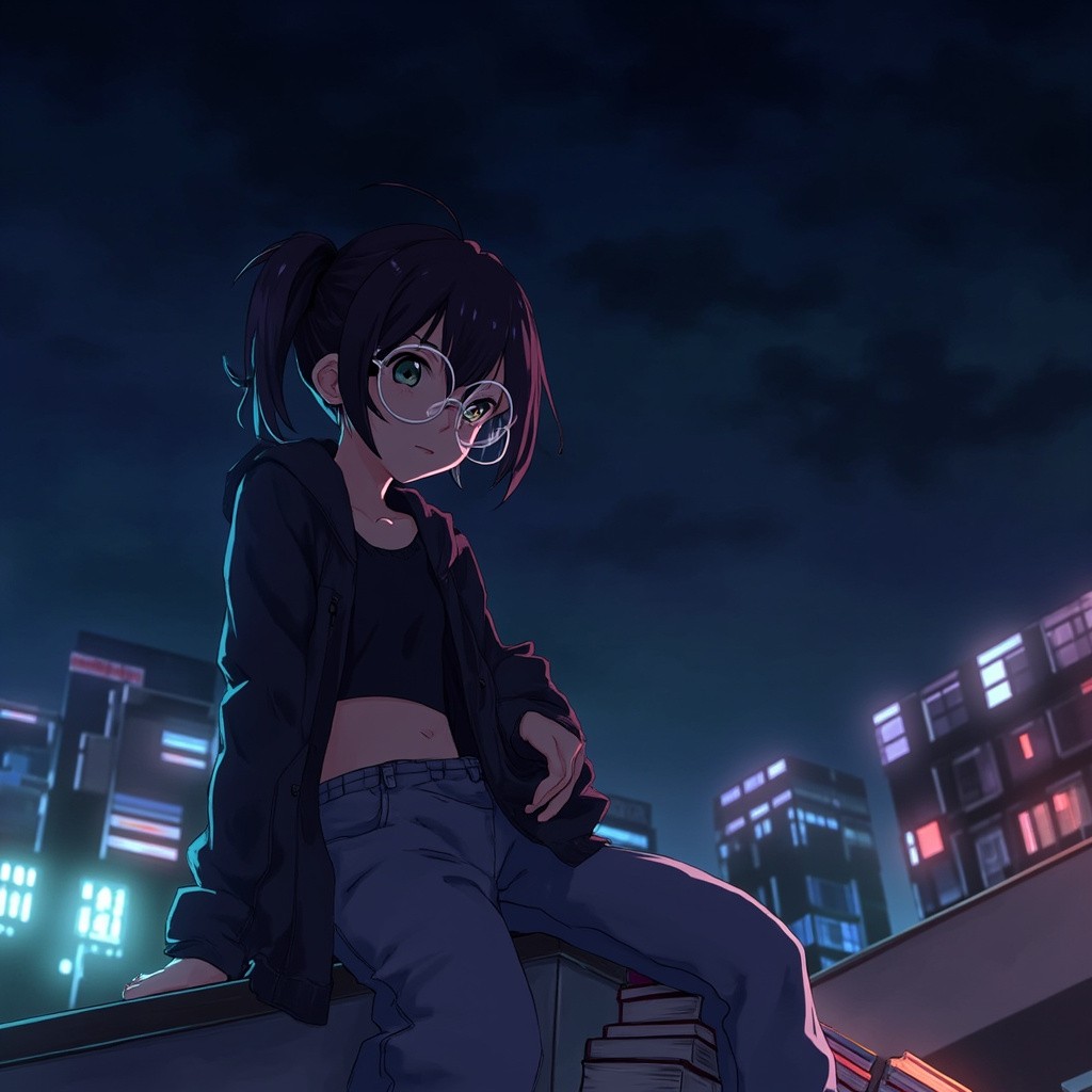 Anime Girl with Dark Purple Hair and Glasses Sitting on Building in Colorful Night
