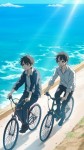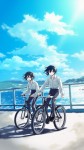 13h Digital artwork, an anime pair riding bicycles near the coast, anime figures illustrated with sketchy ink lines and anime style. The background is a real-life scene with natural lighting and shallow depth of field, professional photo of a blue background with a sunny weather, strong contrast between vivid light areas and rich dark tones, with a creatively blended visual style.