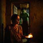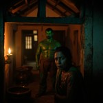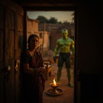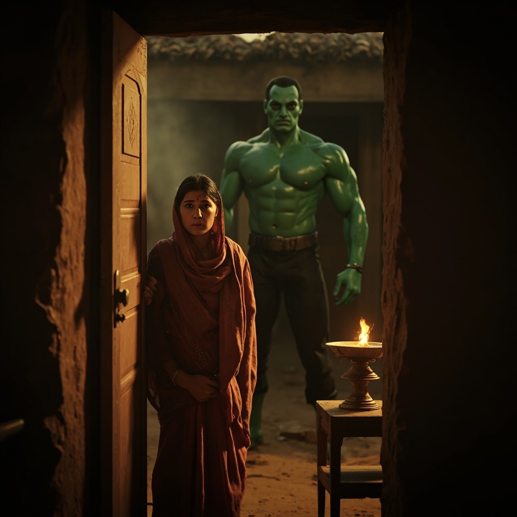 Cinematic emotional scene inside a small Indian rural house at evening time. A worried Indian mother standing near the door with anxious expression. Warm low light from an oil lamp. In the background a tall muscular green superhero (original character, not copyrighted) standing serious and determined. Realistic Indian village interior, clay walls, simple furniture. Soft dramatic lighting, emotional atmosphere, ultra realistic faces, Bollywood drama style, shallow depth of field, 4K realism --ar 9:16 --v 6 --style raw --q 2