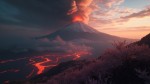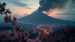 A distant, iconic view of Mount Fuji from a low vantage point, symmetrical composition similar to classic photography of Mount Fuji, but the mountain is now an erupting volcano, ash-covered skies, dark and smoky atmosphere, volcanic ash falling slowly from the sky, glowing rivers of magma and lava flowing down the slopes, apocalyptic mood, cinematic lighting. In the foreground, delicate cherry blossoms (sakura) are blooming, creating a striking contrast between destruction and beauty. Ultra-realistic photography, high detail, 8k --ar 9:20 --profile c2i8iz7 --v 7