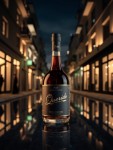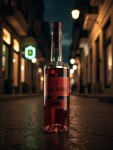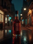 Photorealistic product mockup of a vermouth bottle inspired by a vintage Argentinian siphon bottle, made of elegant glass with refined details. The bottle features a sophisticated and minimalistic label design with the brand name 'Querido', using modern minimalist typography subtly inspired by Argentinian fileteado porteño (ornamental art), warm color palette (deep reds, earthy tones, black, dark blue and soft gold). Stylish, artisan look, balanced between nostalgic cultural elements and modern premium beverage design. Clear, detailed focus on the bottle: shape, material, label, and overall aesthetic.Background featuring a retro Buenos Aires street scene at night, with visible vintage buildings and architecture, no pedestrians. Subtle urban atmosphere with softly blurred details, but ensuring recognizable structures and façades. Soft shadows, warm light gently filtering through glass surfaces. High-resolution, cinematic-quality scene crafted for a professional marketing ad, with carefully detailed textures, reflections, and lighting to enhance realism and nostalgic ambiance.