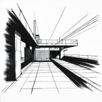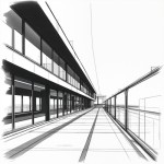 A black and white architectural rendering of a modern building, viewed from a 45-degree angle in strong linear perspective. Sharp lines, high contrast shadows, dramatic depth, minimalistic style, with clear vanishing points. The scene should feel artistic and clean, similar to architectural sketches or concept illustrations. only monochrome tones