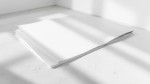 a photorealistic image of a magazine folded in half showcasing the blank white A4 page at the front. its sitting on a light concrete surface The framing of the image is a little offset and framed artistically to make for a less rigid visual, but it still looks intentional - focus is on the magazine in a bright white room. It's minimalistic and the magazine is very slightly cropped out of the image. The contrast is high with graphic shadows. shot with a 50mm camera lens in an urban, editorial space. keep it cool and minimal and mostly monochromatic but well lit with a high white point and a high contrast black point. bright studio lighting and the stack is slightly misaligned. visual is urban, editorial and a high-quality, professional product shot
