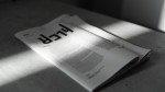 a photorealistic, hyperrealistic image of a an a4 magazine spread folded in half so only one page is the focus, its sitting on a concrete table in an urban room. The framing of the image is a little offset and framed artistically to make for a less rigid visual, but it still looks intentional - focus is on the magazine in a bright publication house room. It's minimalistic and the magazine is very slightly cropped out of frame at the bottom left corner and the shot is taken from directly above. The contrast is high with graphic shadows. shot with a 50mm camera lens in an urban, editorial space. keep it cool and minimal and mostly monochromatic but well lit with a high white point and a high contrast black point. bright studio lighting . visual is urban, editorial and a high-quality, professional product shot that will be used for a behance design portfolio mockup