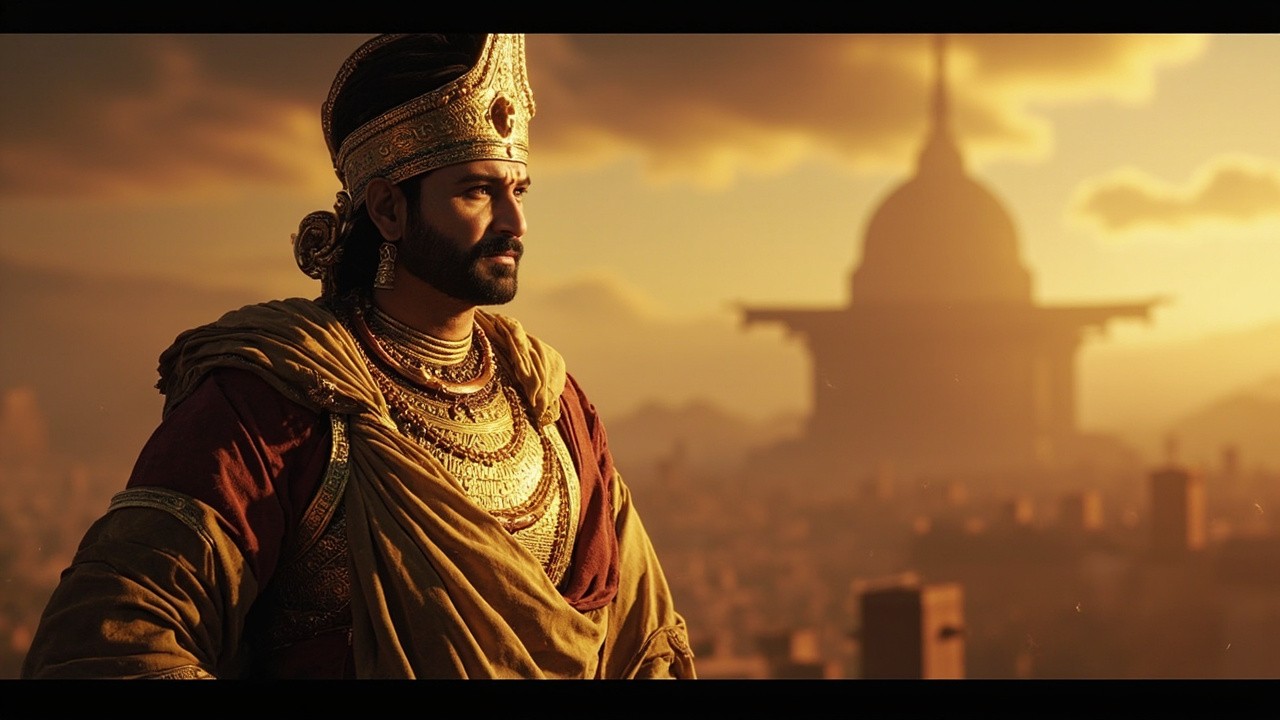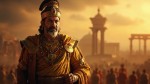 Ancient Indian Emperor Ashoka in Mauryan Royal Attire with Softly Glowing Chakra Symbol