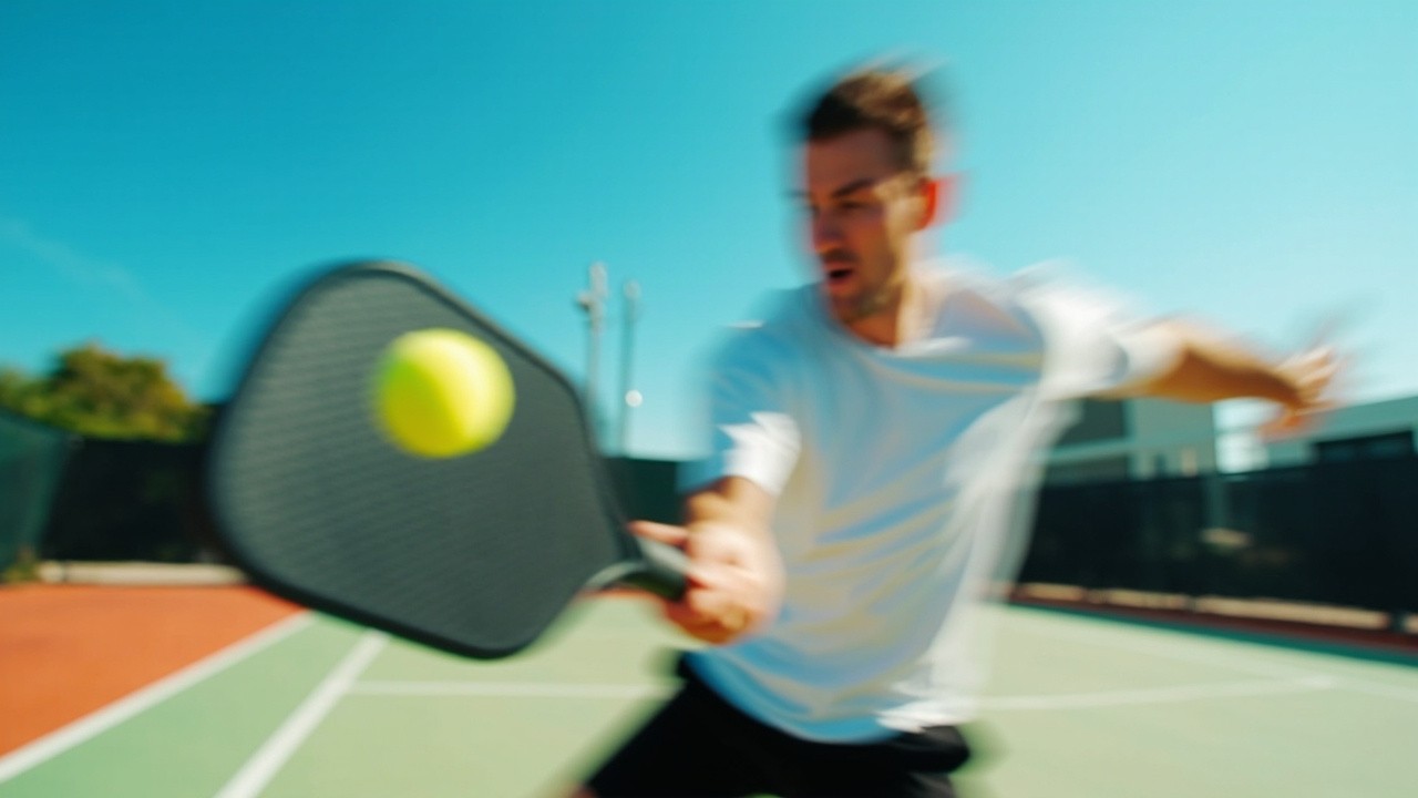 Professional Athlete Hitting Pickleball Mid-Swing on Outdoor Court Banner