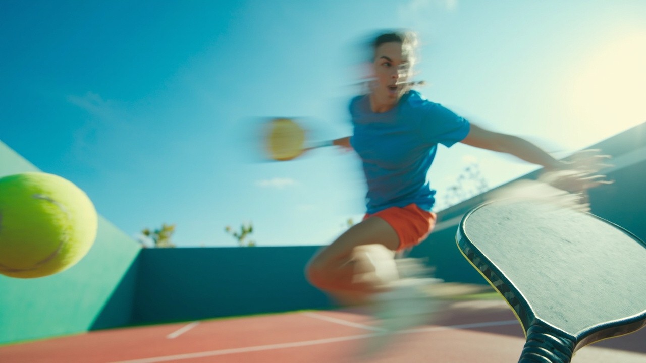 A dynamic hero banner showing a professional athlete mid-swing hitting a pickleball on a modern outdoor court. Motion blur captures the energy and speed of the game. The paddle is in sharp focus with a carbon fiber texture. Bright daylight, blue sky, and a vibrant court background. Minimalist composition with negative space for website text. Photorealistic, high contrast, ultra-detailed, energetic and inspiring, 16:9 aspect ratio.