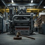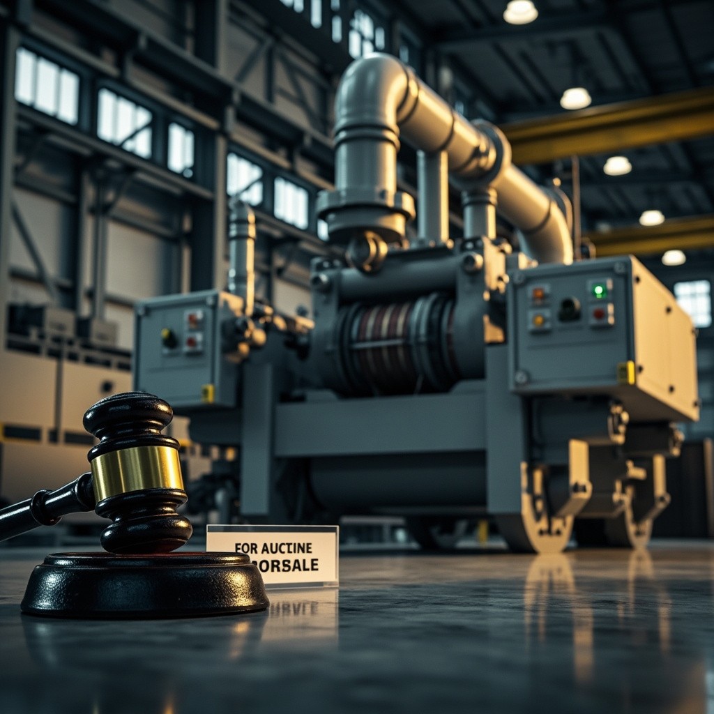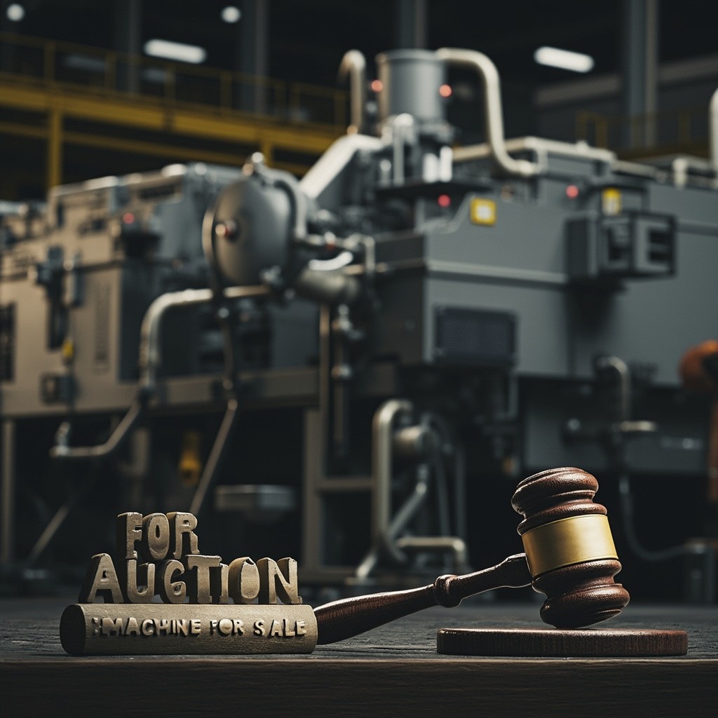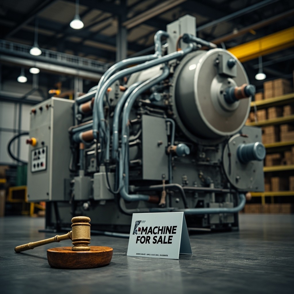 A realistic industrial machine placed inside a factory or warehouse, large metal machinery with pipes, control panels and mechanical parts. In the foreground, clear signs of auction or sale, such as a gavel (auction hammer), “FOR AUCTION” or “MACHINE FOR SALE” board placed in front of the machine. The background shows an industrial environment — factory floor, steel structures, warehouse lighting. Mood is professional and serious, business documentary style. No people visible, no faces. Realistic lighting, sharp focus, high detail, natural shadows. Color tone: neutral industrial colors (grey, steel, yellow highlights). Aspect ratio vertical 9:16, ultra-realistic, suitable for YouTube Shorts / Instagram Reels.