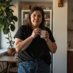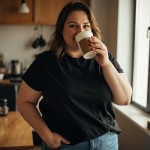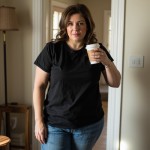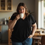 A medium weight, average-looking mom with brown hair, wearing a plain black short-sleeve crew neck t-shirt, denim jeans, and brown boots. Standing and facing the camera directly while drinking a coffee, natural lighting, realistic proportions, full body view, soft indoor background, no logos or designs on the shirt, photorealistic style