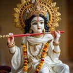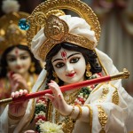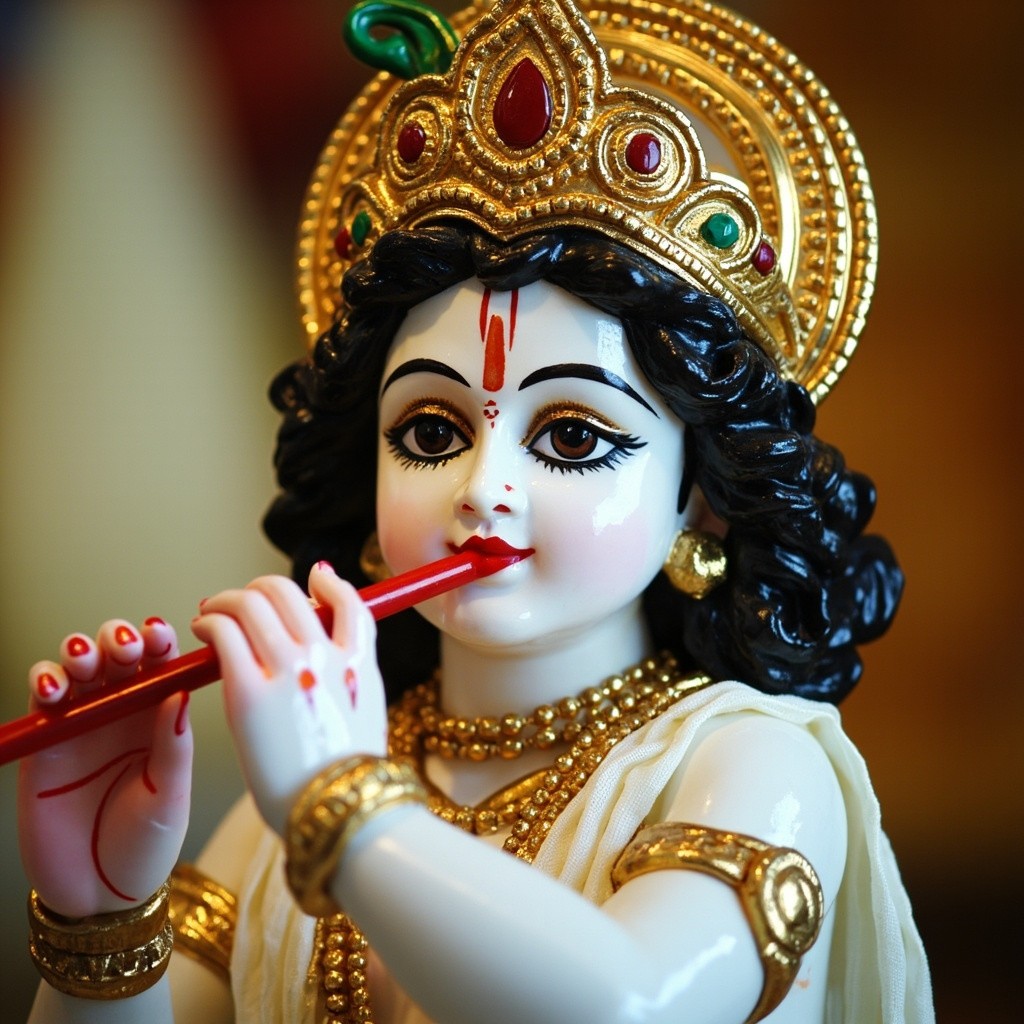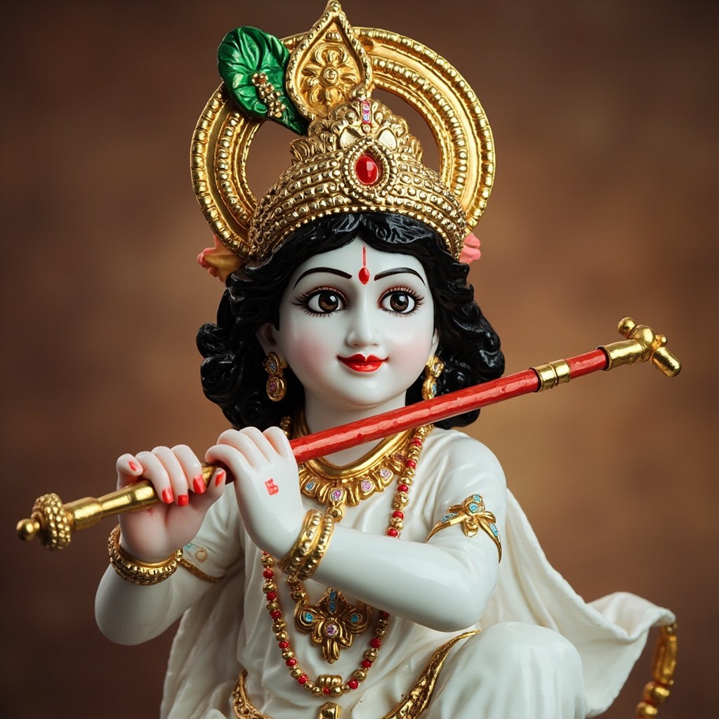 Baal Krishna in White Dress with Golden Crown and Red Bansi