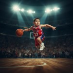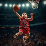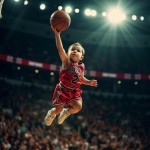 No crop, full view, realistic photo of a baby up to 3 years old imagined as a famous basketball player flying with the ball towards the basket for a slam dunk. The baby, mimicking the iconic pose of a renowned athlete in mid-air, wears a miniature version of the basketball uniform, complete with sneakers and a determined expression. The photography style is dynamic and inspirational, capturing the essence of sporting greatness and childhood imagination. Illuminate the scene with dramatic, high-contrast lighting and atmosphere reminiscent of a professional basketball game under the arena lights, emphasizing the intensity and focus of the moment. The portrait is taken on a DSLR camera - Canon EOS-1D X Mark III, using an EF 70-200mm f/2.8L IS III USM lens at an aperture of f/4.0. This aperture ensures the baby and the basketball are in sharp focus against a slightly blurred crowd in the background, heightening the dramatic effect. The camera settings include an ISO of 800 and a shutter speed of 1/1000, perfect for capturing the fastpaced action without any blur, freezing this whimsical and ambitious leap in time.