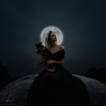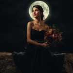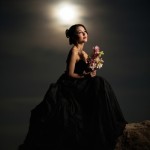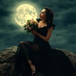 Beautiful Woman Sitting on Rock Holding Flower with Moonlight in Black Dress
