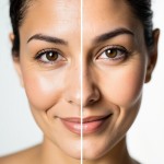 A realistic split image showing a before and after comparison of asian or cocasian treated with a wrinkle smoothing clinic, left side shows middle aged wrinkled face, right side shows healthy, smooth, moisturized skin. natural Egyptian facial features or skin tone, soft lighting, clean white background, minimal and natural look, suitable for skincare product advertisement