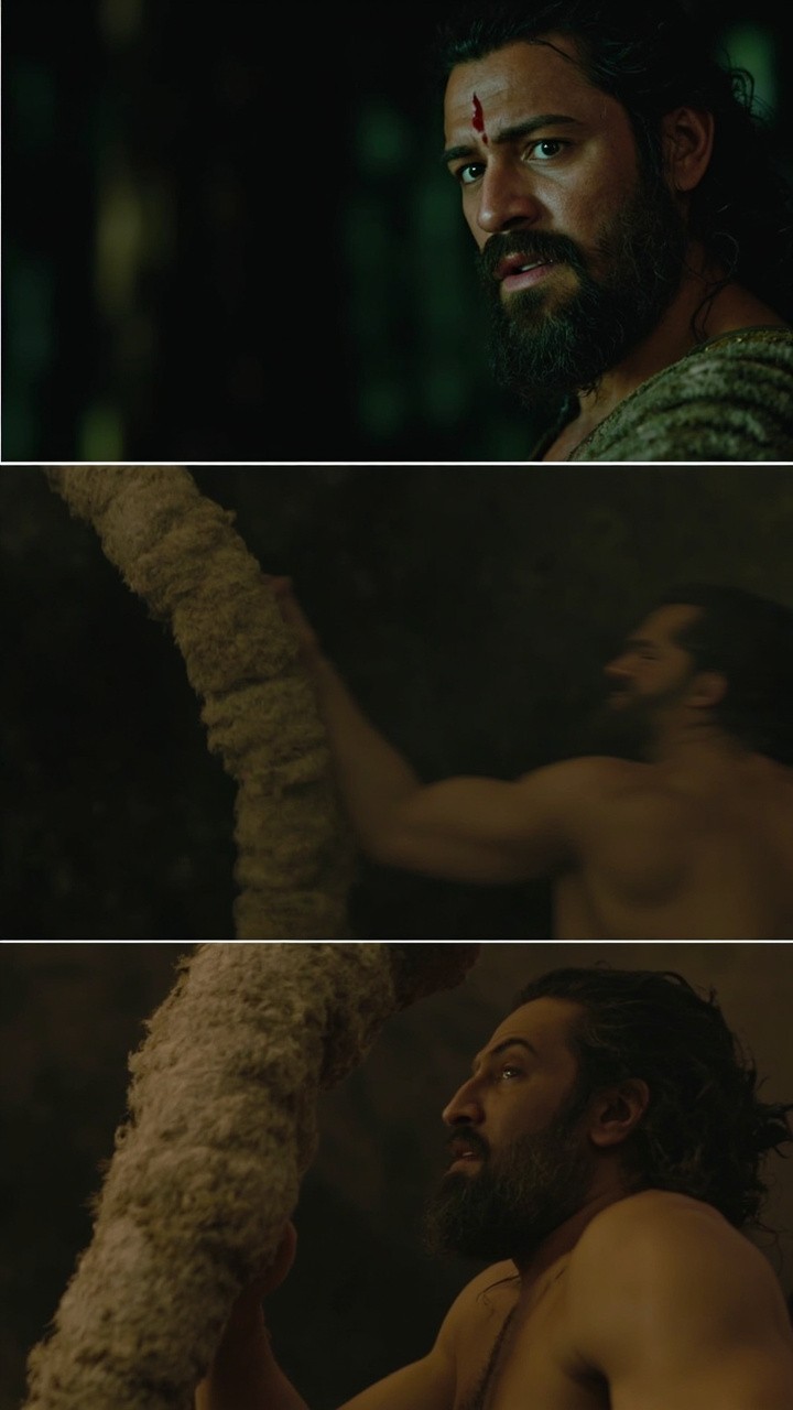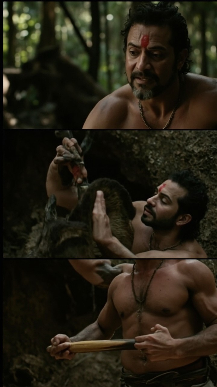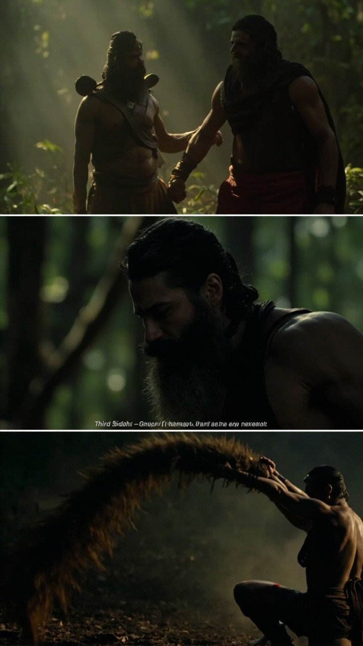 --SHOT START-- [Time Segment]: 20–25 sec Scene Description: Forest clearing from Mahाभारत era. Action: Bhim strains to lift Hanuman Ji’s tail—fails. Characters: Hanuman Ji (calm), Bhim (muscular warrior). Dialogue (VO): “तीसरी सिद्धि— गरिमा।” “इतना भारी कि कोई हिला न सके।” Camera Angle & Motion: Low-angle close-up on tail. Lighting: Strong contrast shadows. Mood/Tone: Humbling, powerful. Effects: Ground vibration. Consistency Instructions: Tail texture and size consistent. --SHOT END--