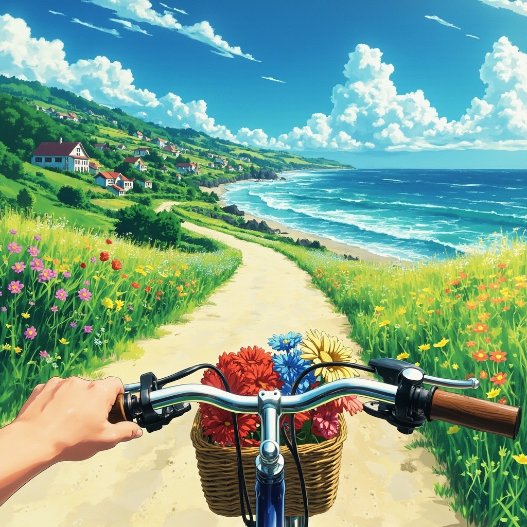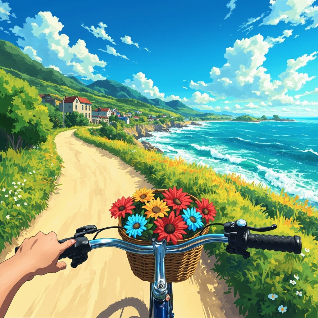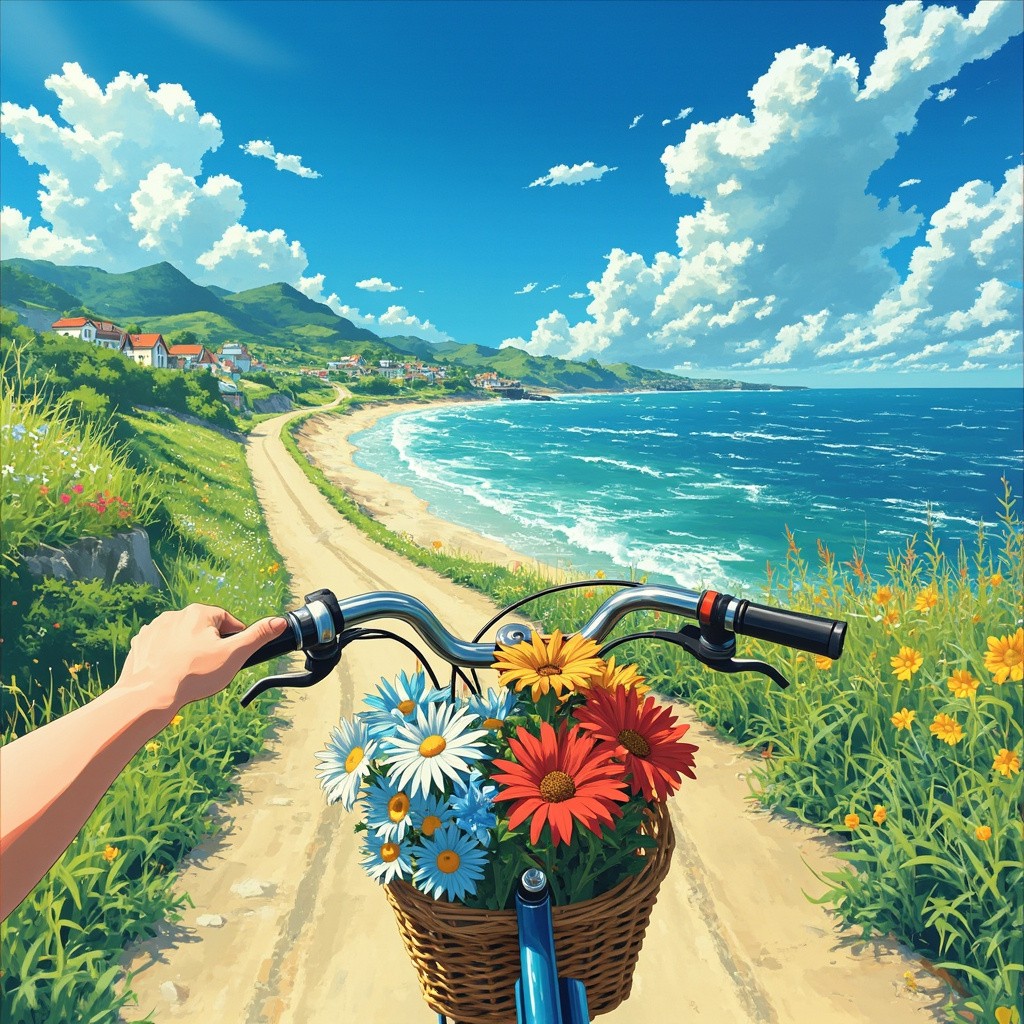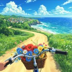 Anime-Style Coastal Bike Ride with Colorful Flowers in Basket