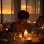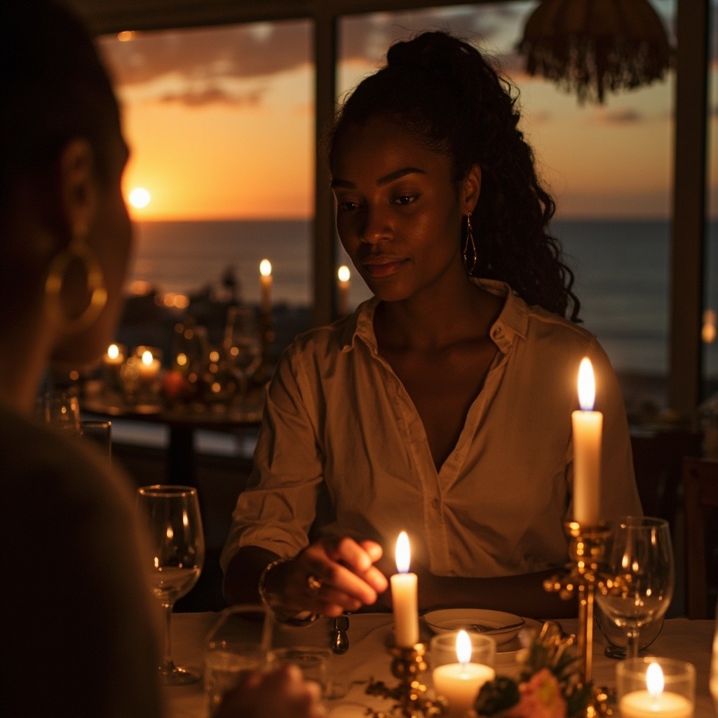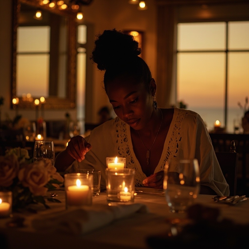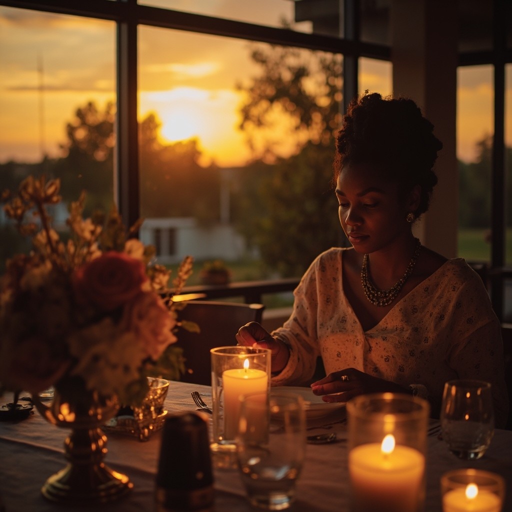 Black Woman Lighting Candle in Elegant Dining Room at Sunset