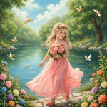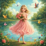Blonde Girl in Pink Dress with Roses by River with Birds and Butterflies