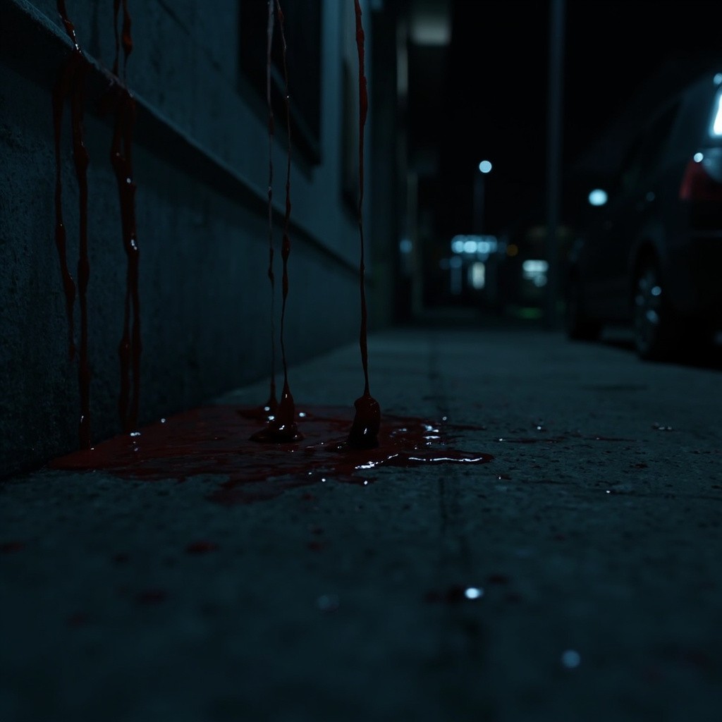 Close-Up Animation of Blood Dripping on Sidewalk at Midnight