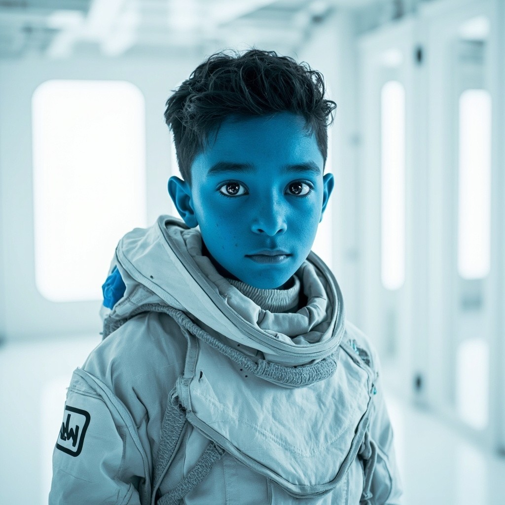 Teen with Blue Skin and Black Hair in Futuristic Space Suit