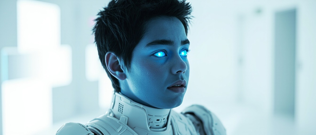 Teen with Blue Skin, African Hair, Glowing Eyes in Futuristic Suit