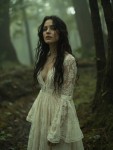Romantic Bohemian Woman in Lace Dress in Misty Forest