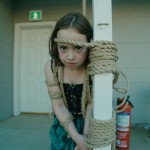Bound Girl in Teal Skirt and Black Top with Fire Exit in Background