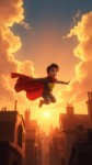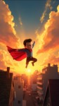 Little Boy in Superhero Cape Leaping Across Rooftops at Sunset