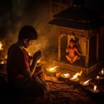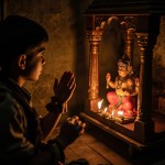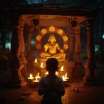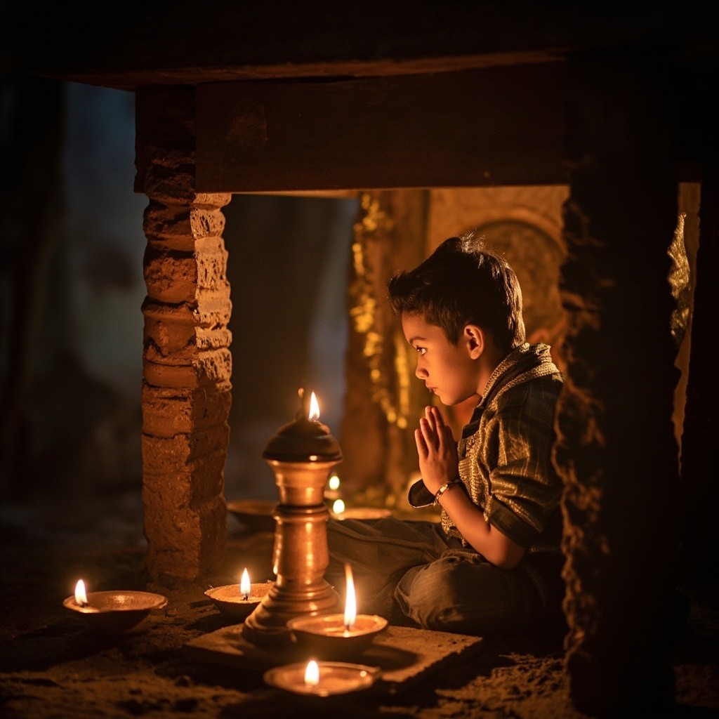 Boy Praying at Glowing Hanuman Temple in Village