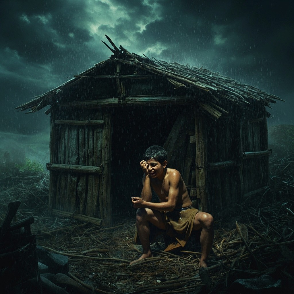 Dramatic Scene of Boy Praying to Hanuman in Storm near Collapsing Hut