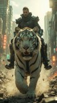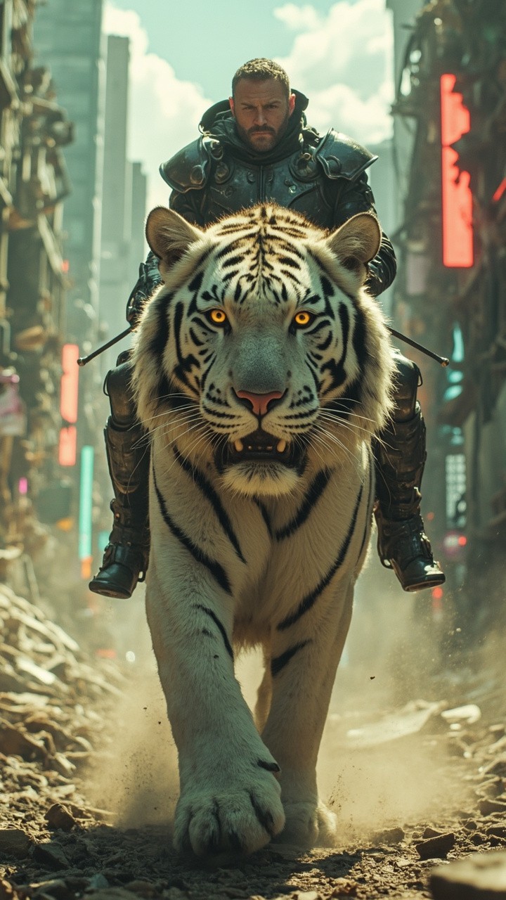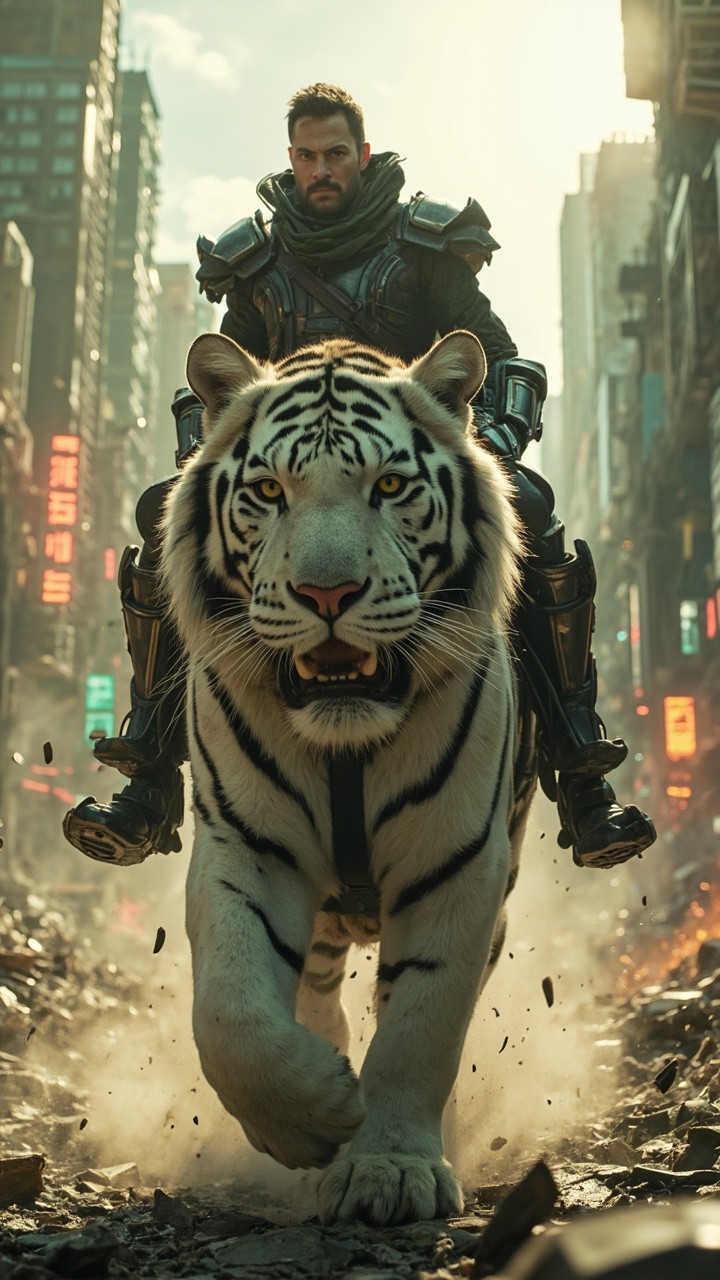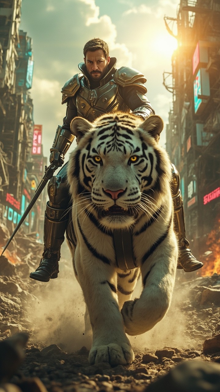 Character Riding Armored White Tiger in Sunlit Cyberpunk Ruins