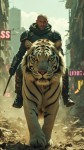 Medium shot from a frontal perspective, focused on the determined face of a character riding a giant armored white tiger with piercing golden eyes. The tiger strides confidently through a sunlit cyberpunk ruin city, its fur flowing naturally as both exhibit unwavering resolve. Collapsed skyscrapers and fractured neon signs frame the scene, with sunlight piercing through debris clouds, creating a post-apocalyptic fairy-tale adventure atmosphere with cinematic high-definition quality.
