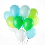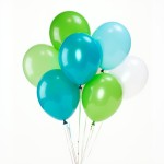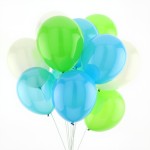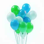 Bright Green, Blue, and White Helium Balloons Moving Upwards on White Background