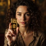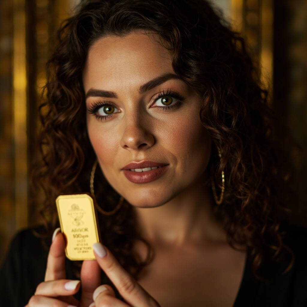 A beautiful 30-year-old brunette with curly hair and expressive green eyes, photographed close-up against a dark gold background. She is wearing modern clothing. The background features blurred antiques and golden tones. A close-up of her holding a 100-gram Argor gold bar. The bar is a natural, high-quality image.