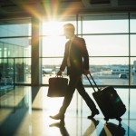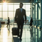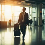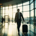 Businessperson in Suit Pulling Suitcase in Modern Airport Terminal
