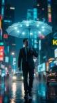 Futuristic Drone-Umbrella, Confident Businessman Walking Under Logo Rain, 3D City Reflection