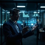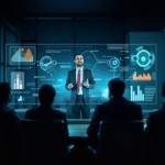 Businessman with 3D Charts Giving Virtual Presentation in Dark Conference Room