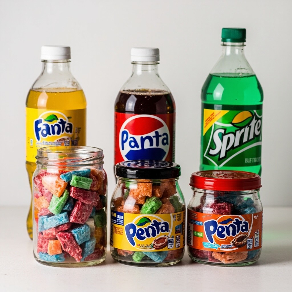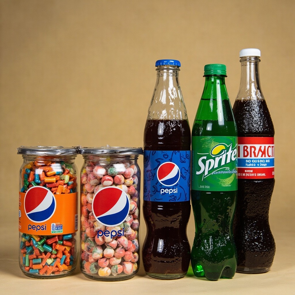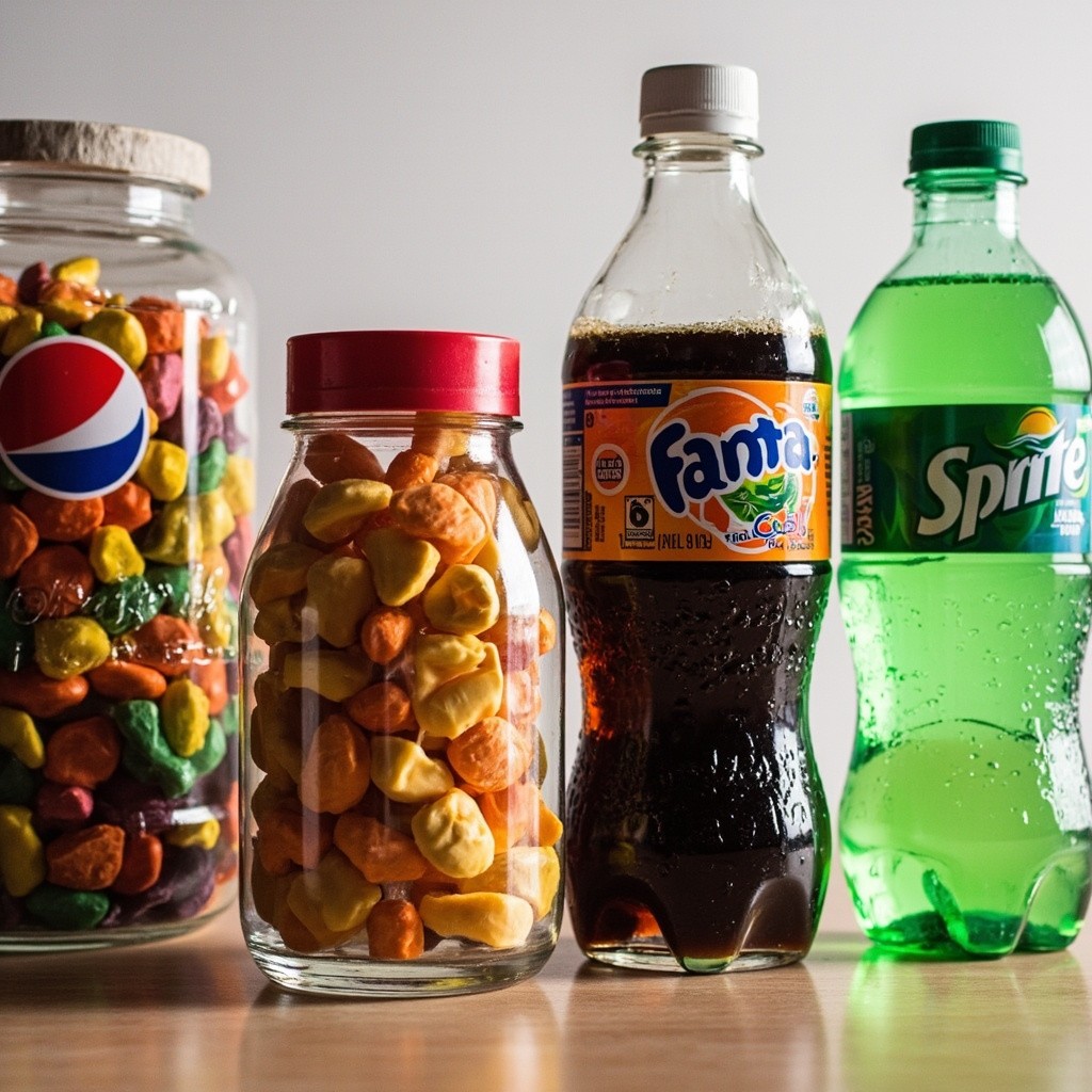 Assortment of Candy in Jars and Soft Drinks Including Fanta, Pepsi, Cola, Sprite