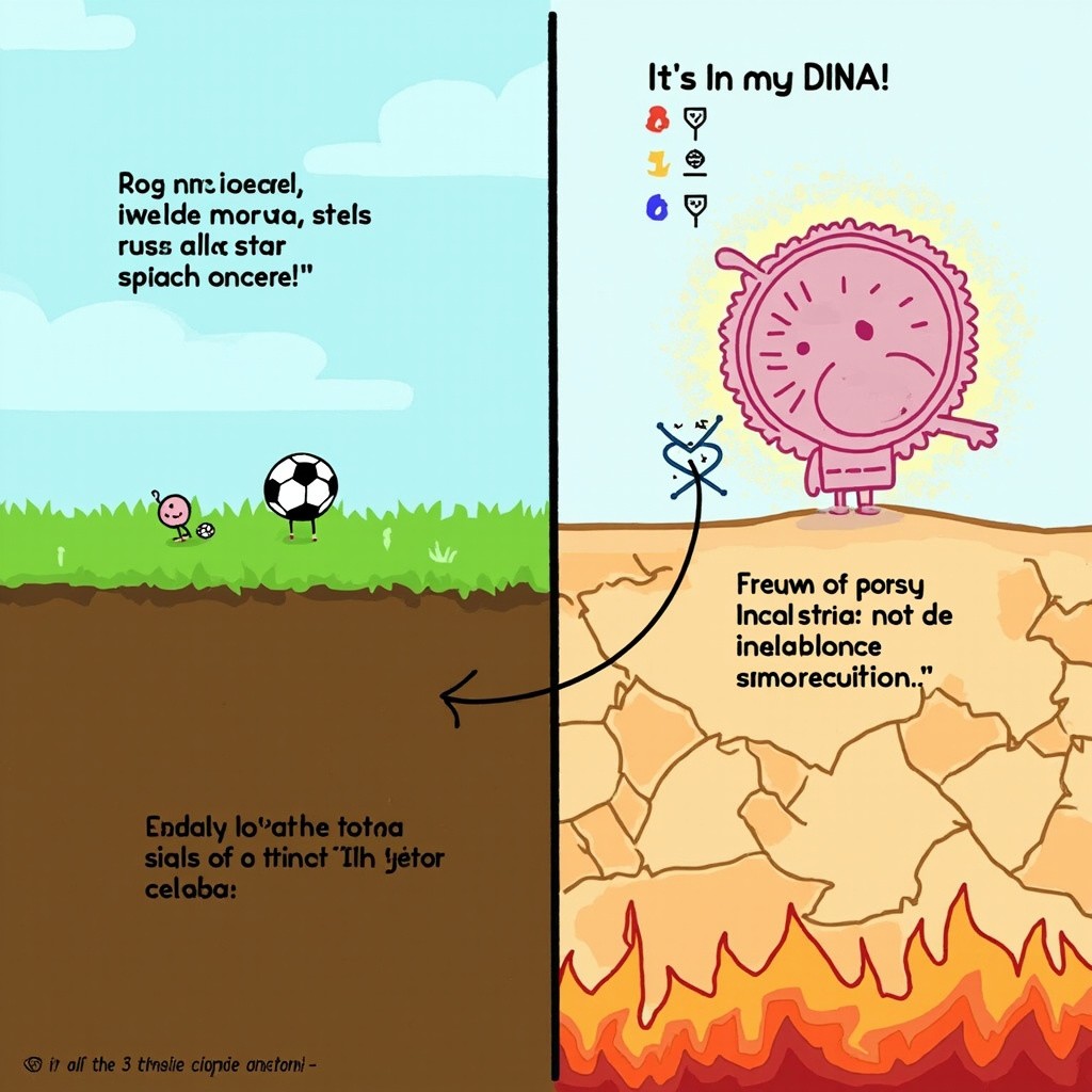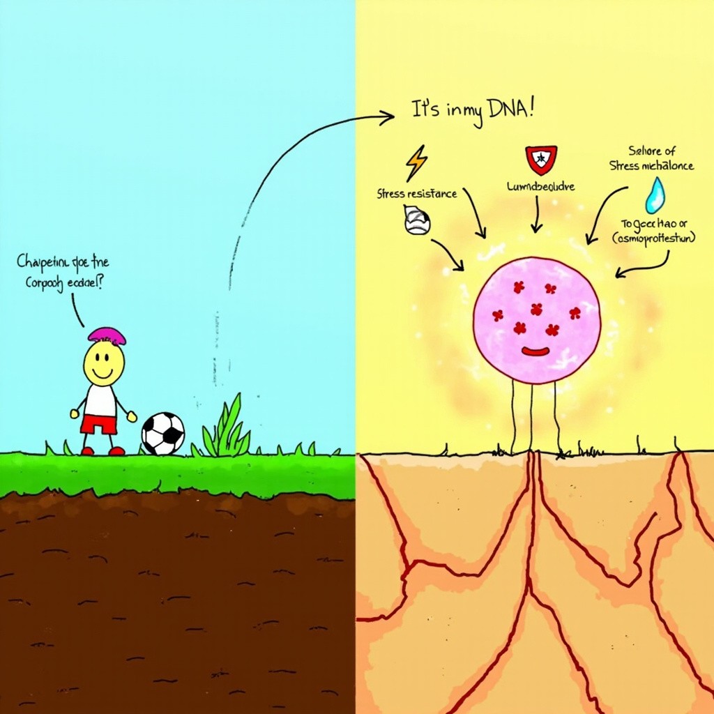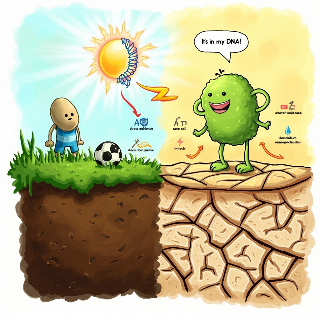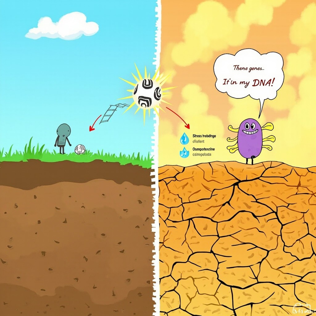 Create a cartoon-style illustration for a scientific presentation. The left side is healthy soil/grass with one simple microbe player and small soccer ball. The right side is cracked, saline soil under heat with one large 'all-star' microbe standing on the soil, glowing aura, and speech bubble saying 'It’s in my DNA!'. Include a small DNA helix icon behind the all-star microbe and three simple icons for genes: shield (stress), lightning (metabolism), water drop (osmoprotection). Show a curved arrow from the ball on the left to the all-star microbe on the right representing a 'carbon pulse'. Keep style colorful, clear, simple, cartoonish, suitable for a 3-minute thesis slide