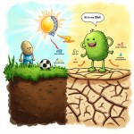 Colorful Cartoon Illustration of Healthy and Saline Soil with Microbes Playing Soccer for Scientific Presentation