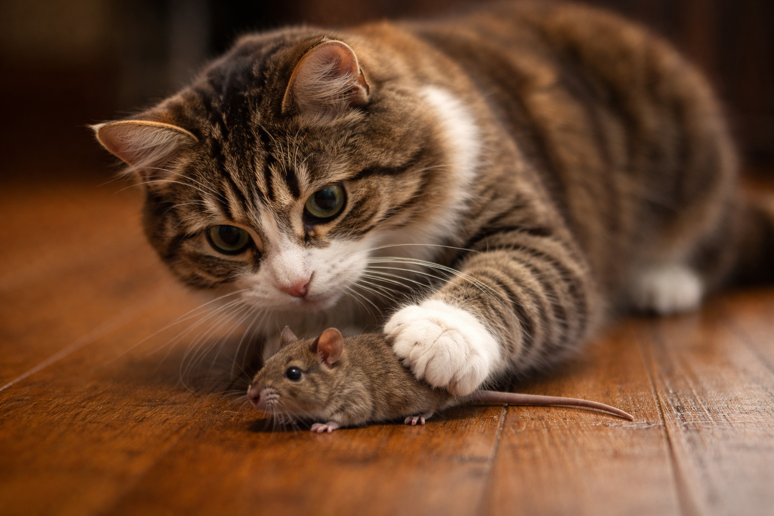 Cute feline playing with small mouse toy.