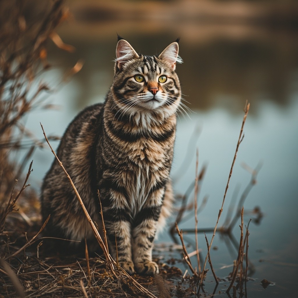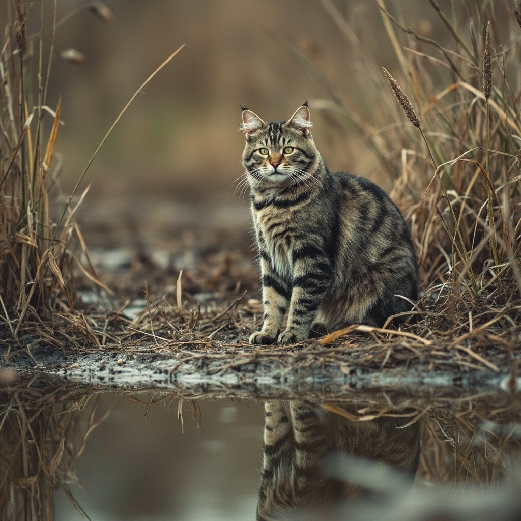 Cat Standing on Pond Shore Amidst Reeds
