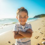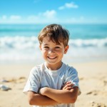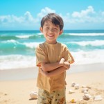 Cheerful Boy on Sunny, Seashell-Littered Beach
